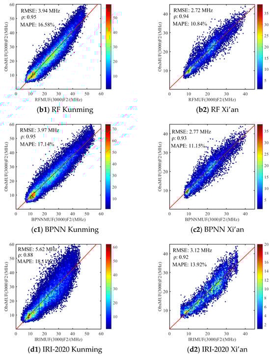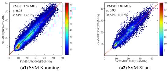 In this section, the performances of the three machine learning models are evaluated. And the IRI-2020 model is used as a reference model. Figure 12a1,b1,c1,d1 present the results of the observation and machine learning model at Kunming station, and Figure 12a2,b2,c2,d2 present the results at Xi’an station. The vertical coordinate ObsMUF(3000)F2 denotes the MUF(3000)F2 observations, the horizontal coordinates SVMMUF(3000)F2, RFMUF(3000)F2, and BPNNMUF(3000)F2 denote the MUF(3000)F2 estimations of the three machine learning models, respectively, and IRIMUF(3000)F2 denotes the MUF(3000)F2 results of the IRI-2020 model, and the value of the colorbar denotes the number of samples.