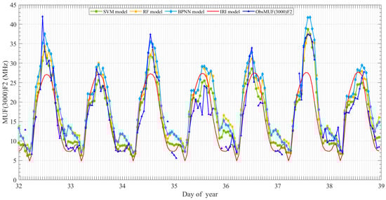 Values of MUF(3000)F2 versus DOY obtained by models of SVM, RF, BPNN, IRI, respectively, and observations at Kunming station during the magnetically quiet days (1–7 February 2009).