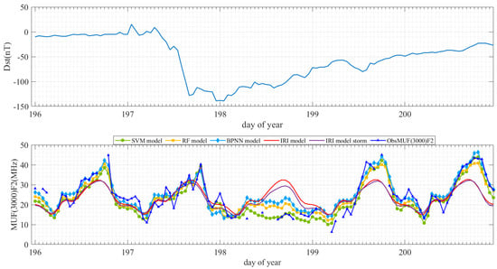 Dst values versus day of year (DOY) from 196 to 200 in the year 2012 (upper panel). Comparison of MUF(3000)F2 variations versus day of year (DOY) among observational data from Kunming station and estimates from SVM, RF, BPNN, and IRI models during geomagnetic disturbances, presenting both the storm mode disabled (red curve) and enabled (purple curve) configurations of the IRI model (lower panel).