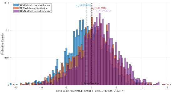 Histograms of MUF(3000)F2 estimation errors (probability density) for SVM, RF, and BPNN models during geomagnetic storms at Kunming station (2008–2013).
