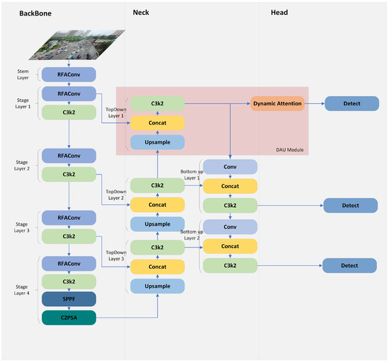 In the proposed network, the neck retains a PAFPN architecture. PAFPN incorporates a bottom–up pathway after the top–down pathway of FPN, reinforcing the feature hierarchy by integrating precise localization signals from lower layers through bottom–up path augmentation. Building upon the two original YOLO11 top–down and bottom–up layers, we made two major modifications. First, a novel module named DAU (dynamic attention and upsampling) is introduced at the top of neck. This module enhances small object feature extraction through upsampling and maximizes information utilization via spatial-diffusion attention and task-aware attention mechanisms. Second, the positions of the two bottom–up layers have been adjusted. The bottom–up layer in the deep stage is removed and added to the top layer. This allows for full interaction of information between the DAU module and other neck modules while significantly reducing the increase in parameters.