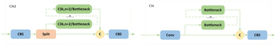 ) using multiple C3K structures or bottleneck structures. Finally, the two feature streams are concatenated and fused using a 1 × 1 convolution. This design maintains a lightweight structure while effectively extracting features of complex scenarios. The structure of the C3k2 block is shown in
