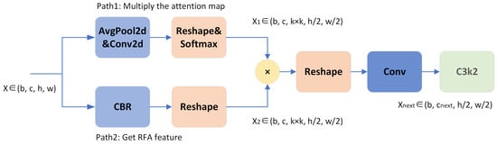In DAU-YOLO, the Receptive-Field Attention module and C3k2 module are utilized to ensure high-quality feature extraction and effective image downsampling. The C3k2 module is a newly introduced feature extraction component in the YOLOv11 model, which can divide the input features into two parts: one part is directly processed through standard convolution operations, while the other undergoes variable convolutional kernels (e.g., 3 × 3,