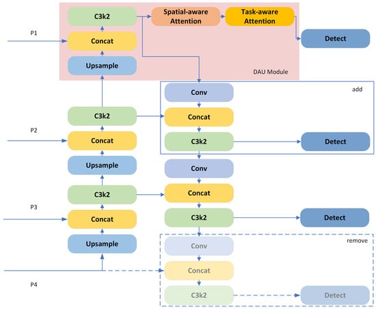 In the backbone, apart from the stem layer, there are four stage layers, each performing downsampling. We refer to the outputs of these four layers as P1, P2, P3, and P4. In YOLO11, the features P2, P3, and P4 are concatenated with the output features from the next lower top–down layer in the neck, followed by the C3K2 operation. It is generally believed that during the downsampling and feature extraction process in images, shallow layers undergo fewer downsampling operations, preserving richer fine details of small objects, while deep layers primarily capture global information about objects and their backgrounds. Therefore, the network aims to fully utilize the shallow features of P1. To achieve this, an initial upsampling operation is performed within the DAU module. The DAU module fully integrates feature P1 with the output of top–down layer 2 and processes them through the C3K2 module for effective feature extraction. Then, we enhanced the extracted features with a spatial-diffusion block and a task-aware block. The structure of DAU module is shown in