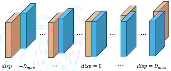 The 4D cost volume generation method. The left feature is shifted from to . In this process, the cost volume is constructed to cover the disparity range from .