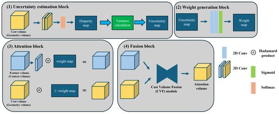 In the equation, represents geometry cost volume, represents context cost volume, and W denotes uncertainty map. The context and geometry cost volumes are calculated as shown in the equation to generate two attention-weighted cost volumes. Through this process, regions with high uncertainty are assigned higher weights for the context cost volume, while areas with low uncertainty affect the geometry cost volume more.