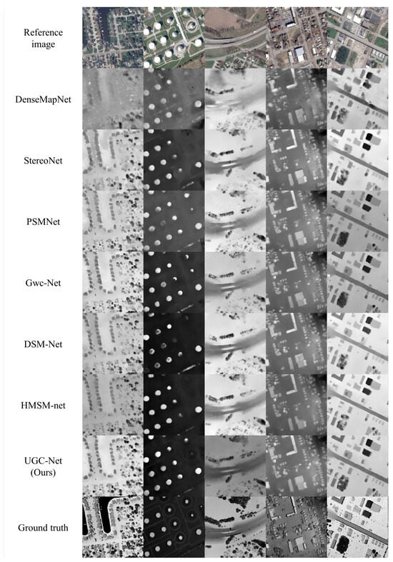 The WHU-Stereo dataset [32] consists of data collected from six regions in China. We set the disparity range to and conducted training accordingly. Table 5 presents the quantitative results for each of the six regions within the WHU-Stereo dataset. Table 6 provides a quantitative comparison of the entire test dataset of WHU-Stereo. The models trained on the US3D and WHU-Stereo datasets differ slightly. In the case of the US3D dataset, due to its relatively small disparity range, the context and geometry cost volumes were trained with 32 channels. On the other hand, for the WHU-Stereo dataset, which has a wider disparity range, the context and geometry cost volumes were reduced to 8 channels to facilitate training. As a result, the proposed model trained on the WHU-Stereo dataset shows lower performance compared to the model trained on the US3D dataset. Nevertheless, our approach outperforms conventional networks and achieves state-of-the-art performance. Figure 5 shows the qualitative comparisons for the WHU-Stereo dataset.