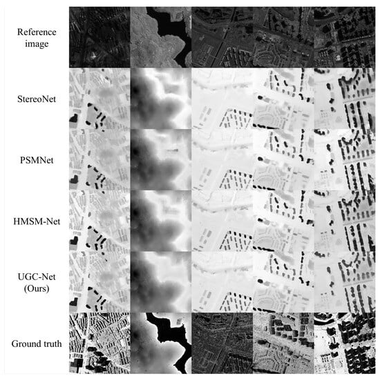 Our model was trained end-to-end, and no data augmentation, cropping, or resizing was applied to preserve the original attributes of the images in both the US3D and WHU-Stereo datasets during training and testing. For the US3D dataset, the disparity range was set to , whereas for the WHU-Stereo dataset, the disparity range was set to . The models for the US3D and WHU-Stereo datasets differ slightly. For the US3D dataset, as the disparity range is relatively small, the context and geometry cost volumes were trained with 32 channels. In contrast, for the WHU-Stereo dataset, which has a more extensive disparity range, the context and geometry cost volumes were reduced to 8 channels to facilitate training. Both datasets were trained and tested using input images with a resolution of 1024 × 1024. For model training, we used the Adam optimizer [33] with a total of 100 epochs. The initial learning rate was set to 0.001 and reduced by half every 10 epochs. The loss weights for training were set to = 0.3 and = 1.0. The batch size was set to 2, and training was conducted on an NVIDIA A6000 GPU running Windows 10.