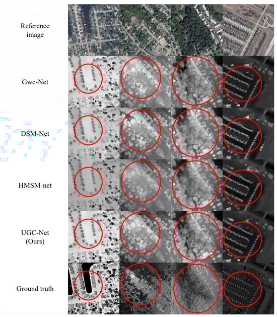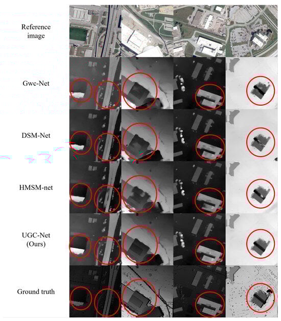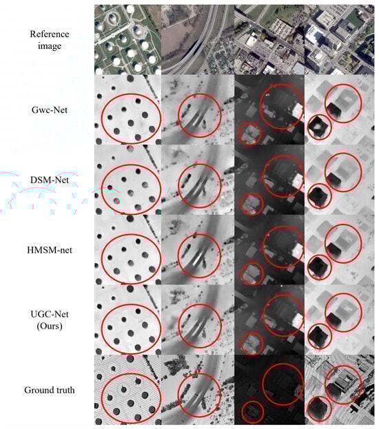 Qualitative evaluation of the disparity maps for texture-less areas. From top to bottom: reference image, Gwc-Net, DSM-Net, HMSM-Net, UGC-Net (ours), and ground truth. From left to right, the image numbers are OMA-247-027-001, OMA-251-001-006, OMA-342-004-031, and OMA-383-005-025. Major differences in the disparity images of each method are annotated with red circles in the figures.