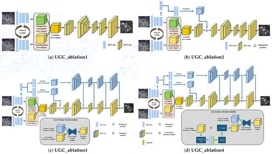 The figure shows the architectural structures corresponding to each ablation model. We conducted experiments by removing specific components from the proposed model. (a) represents UGC_ablation1, where only the geometry cost volume is aggregated to estimate disparity. (b) corresponds to UGC_ablation2, which generates a context cost volume, multiplies it with geometry cost volume to form the attention feature volume (AFV) method, and then performs cost aggregation. (c) represents UGC_ablation3, where only the cost volume fusion (CVF) module within the uncertainty attention module of the proposed method is used. (d) corresponds to UGC_ablation4, where the weight generated using the uncertainty map is applied only to the geometry cost volume in the proposed method.