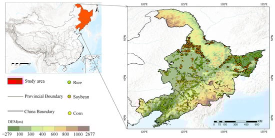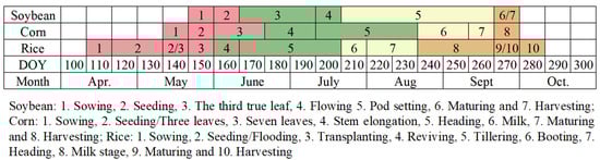The sowing and harvesting calendar of the three main crops in Northeast China is shown in Figure 2 [], which divides the entire growth stage into three periods: early (DOY: 110–180), mid (DOY: 190–240) and late (DOY: 250–280) [].