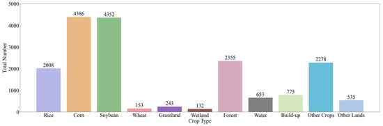 The field survey data for this study were collected from each sample using GIS devices, which recorded the spatial location and land cover type. To ensure the accuracy of the data, all samples were visually verified using high-resolution imagery from Google Earth Engine, eliminating obviously erroneous samples. Samples representing multiple land cover types were collected, covering areas such as rice, corn, soybean, wheat, grasslands, wetlands, forests, water bodies and built-up areas. Of these, a total of 17,870 samples were collected, and the sample distribution is shown in Figure 3. In the experiment, the sample data were divided into three sets, training, validation and testing, in an 8:1:1 ratio.
