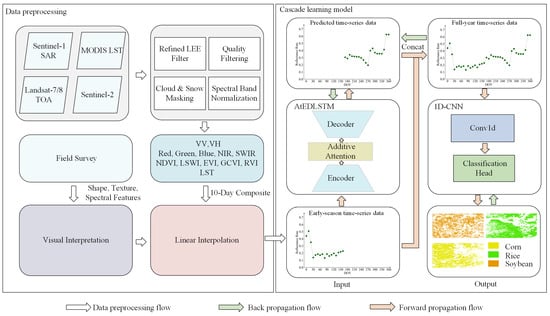 Specifically, this study uses time-series data collected from multiple satellite platforms. First, different data sources undergo preprocessing independently, including denoising with the Refined LEE filter, quality filtering, cloud and snow masking and spectral band normalization. Field survey is conducted to collect ground truth data for calibration and validation. Next, VV, VH and LST are obtained, along with five base bands and various vegetation indices. Ten-day time-series data are constructed by synthesizing the maximum value of GCVI every ten days to retain key growth information. Finally, linear interpolation is applied to ensure data consistency and completeness. After preprocessing, the data are inputted into the cascade learning model.