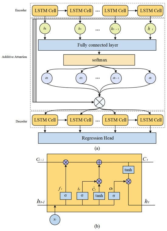 LSTM-based encoder–decoder: The encoder–decoder structure can capture the complex mapping relationship between the input and output through the intermediate hidden states. This enables it to effectively handle complex nonlinear time-series data. Therefore, this study constructs an encoder–decoder structure based on LSTM (Figure 5a).
