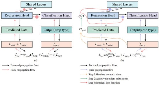 The diagram of gradient normalization. (a) Multi-task cascade learning imbalance training. (b) Multi-task cascade learning training after using GradNorm.