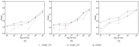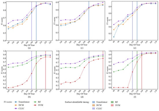 When more phenological information was accumulated (DOY 130–200), the classification advantage of CLEC diminished. After the earliest identifiable timing, its accuracy was comparable to or slightly inferior to that of DCM. This may be attributed to the reduced marginal benefit of the prediction module at later growth stages. Additionally, the classification performance in this stage may be affected by differences in region-specific feature patterns, which challenge the model’s generalization across different datasets. During this period, the classification accuracy of all models tended to saturate, which is consistent with the experimental results in Section 4.2.