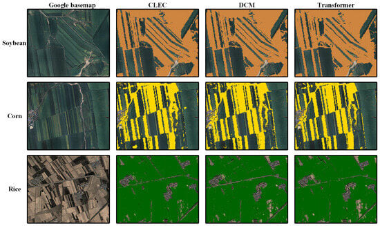 We conducted comparative experiments between CLEC and the baselines used in Section 4.2 and Section 4.3. As shown in Figure 12, CLEC significantly outperformed the other methods during the DOY 100–130 period, which is notably early in the crop growth stage. This highlights the practical value of the CLEC in enabling early and reliable crop classification, potentially offering considerable economic and societal benefits.