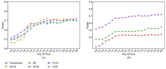 A comparison of the performance of the CLEC with methods for early-season classification in Bavaria, Germany. (a) Comparison of deep learning-based models; (b) Comparison of machine learning-based models.