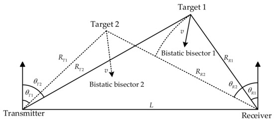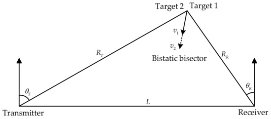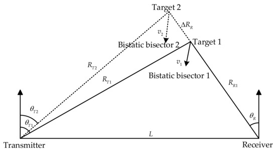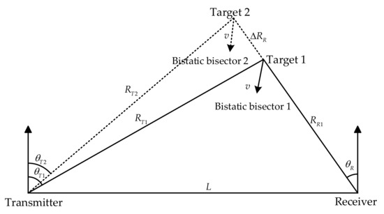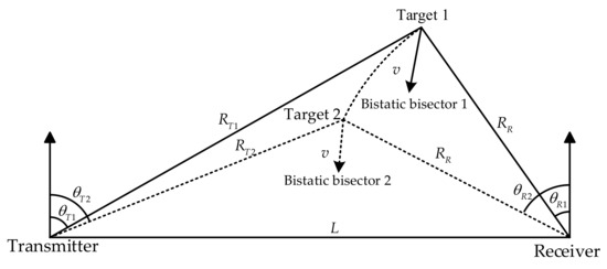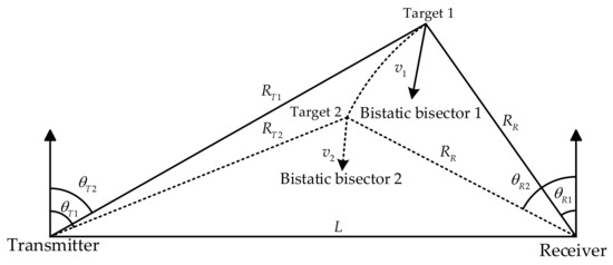 - Reception distance , reception angle, and velocity of Target 1, which is regarded as the reference target, and the direction of velocity parameter is along the bistatic bisector;
