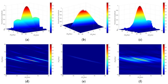 Angle−range profile: (a) Single−tone waveform with linear frequency offset (3D). (b) LFM waveform with linear frequency offset (3D). (c) Single−tone waveform with random frequency offset (3D). (d) Single−tone waveform with linear frequency offset (2D). (e) LFM waveform with linear frequency offset (2D). (f) Single−tone waveform with random frequency offset (2D).