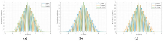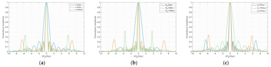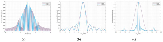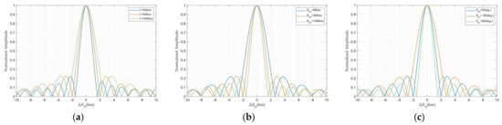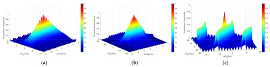 Numerical simulations employing the parametric configurations in Table 2 yield the angular ambiguity functions illustrated in Figure 14. Angular ambiguity functions exhibit similar morphological characteristics to their range–domain counterparts, attaining peak values at without discernible periodic artifacts or angular ambiguities. Notably, however, the angular ambiguity function demonstrates distinct characteristics: A narrower main lobe accompanied by side lobes, whose spatial and amplitude relationships follow an inverse proportionality with the main lobe width. Specifically, (I) a narrower main lobe correlates with side lobes positioned closer to the main lobe and exhibiting higher amplitudes, while (II) a broader main lobe results in side lobes displaced farther from the main lobe with diminished amplitudes or complete suppression. Variations in the bistatic triangular geometry simultaneously modulate both the main lobe width and side lobe characteristics. Increases in baseline length and target–receiver distances , combined with smaller reception angles , produce a narrower main lobe accompanied by elevated side lobe amplitudes concentrated near the main lobe. Conversely, reductions in , or increases in broaden the main lobe while displacing side lobes outward with progressively decreasing amplitudes until their eventual extinction. Furthermore, the analysis reveals a critical threshold behavior: when the main lobe narrows beyond a specific width, geometric modifications exhibit diminishing returns on main lobe compression, indicating a saturation effect in angular resolution enhancement.