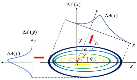 In three-dimensional space, the distribution is non-axisymmetric along the axes. The constructed three-dimensional structure of the gas cloud consists of 512 two-dimensional planes stacked along the axis. The curves and of the data were extracted from the projections of the horizontal line profiles of the absorbance images from the two cameras, fitted using a non-axisymmetric Gaussian function of the form shown in Equation (9) [31,32]