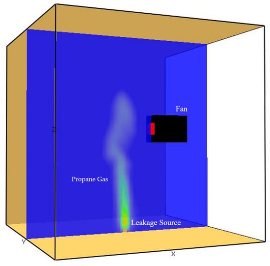 In order to validate the effectiveness of our approach, NIST’s Fire Dynamics Simulator (FDS) was used to simulate a 3D gas concentration distribution. The software numerically solves the Navier–Stokes equation for low-speed thermally driven flows to simulate low-speed airflow, smoke, and heat transfer [33]. The specific simulation scenario mainly used one of the HVAC (Heating, Ventilation, and Air Conditioning) systems, which consists of one vent and one fan. As shown in Figure 9, the simulation experiments modeled the changes of a 35 °C propane gas stream leaking through a fixed-sized hole into a 20 °C space. A fan with a fixed radial flow (0.1 m3/s) was set up 2.0 m directly above the leakage hole and 1 m horizontally to simulate the effect of wind (fixed volumetric flow), and the gas flow was obtained using the coupled HVAC network solver provided with the software during the simulation. The size of the simulation space was 6 m × 6 m × 6 m, the number of mesh grids was 50 × 50 × 50, and the resolution of the image space was 7.5 mm × 7.5 mm × 7.5 mm.