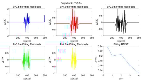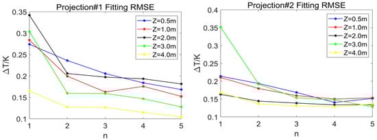 For the two projections in the #1 and #2 directions at time , the temperature horizontal line contours and slices of the gas temperature distribution in the x–y plane were obtained for five locations along the z-axis direction (i.e., at heights of z = 0.5 m, 1.0 m, 2.0 m, 3.0 m, and 4.0 m). Figure 11 shows that, with an increase in the order of the asymmetric Gaussian function to fit the temperature level contour, the RMSEs of the asymmetric Gaussian function at different positions have a tendency to decrease gradually; in particular, the fifth-order asymmetric Gaussian function had the best fitting effect. Table 2 shows the average RMSEs at the five positions, and the order 2–4 asymmetric Gaussian functions showed a similar fitting effect, with no significant difference. The fifth-order asymmetric Gaussian function, in comparison with the second-order function, had an average fitting accuracy in the two projection directions that was higher by 34.42% and 17.98%, respectively; however, for the single-layer temperature level contour in one projection direction, fitting using the fifth-order function took 6.11 times longer. Therefore, the second-order function was used for fitting, which can achieve reasonable fitting accuracy within a shortest time, yielding better overall performance.