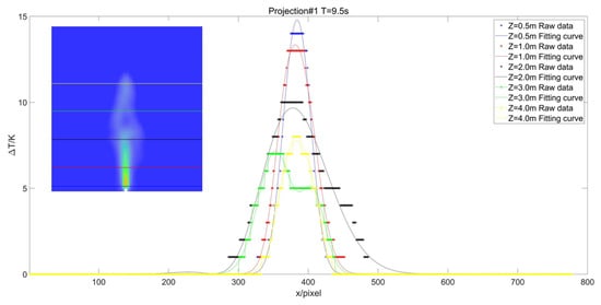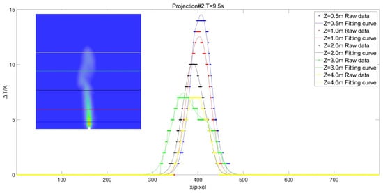 Figure 12 and Figure 13 show the temperature distribution and asymmetric Gaussian function fitting in the direction of projection #1, respectively, while Figure 14 and Figure 15 show the temperature distribution and asymmetric Gaussian function fitting in the direction of projection #2, respectively. The maximum RMSE in the two directions was 0.2385. After being affected by the wind, for the locations where the shape profile of the gas cloud has been significantly changed, the RMSE value will increase; however, the fitting accuracy will not be significantly decreased in those other locations that are not affected by the wind.