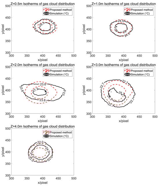 Based on the temperature contour data obtained from the projection #1 and #2 directions in the simulation data at , the internal temperature distribution of the single-layer gas cloud was calculated using the method detailed in Section 2.3.4 of this paper, and the temperature distribution isotherms of the gas cloud obtained through simulation and the reconstructed temperature distribution isotherms were plotted, as shown in Figure 17 (with a step size of 5 K). The statistical curves of the reconstructed distribution of the projected temperature field and those of the original data were compared and, in the graphs at Z = 0.5 m, 1.0 m, and 4.0 m, the reconstructed temperature distributions were consistent with the simulation data. In the figure, the reconstructed temperature distributions deviated less from the simulated temperatures at Z = 0.5 m, 1.0 m, and 4.0 m; meanwhile, at Z = 2.0 m and 3.0 m, the distortion of the gas cloud shape was increased as the gas cloud was more obviously disturbed by the external wind, such that reconstruction could not be completed in some areas; however, the core temperature position was correctly reconstructed.