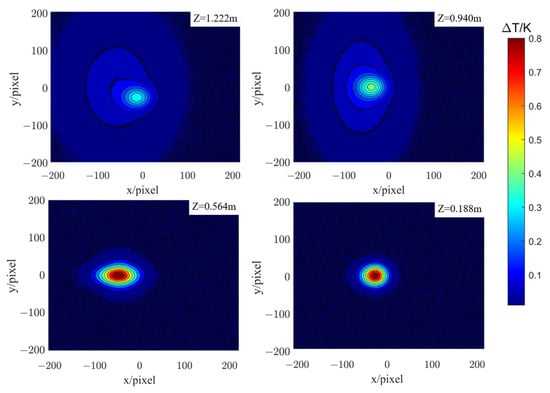 Using the asymmetric IAT method, the temperature distribution of each cross-section of the gas cloud was reconstructed and, based on the radiative correction of the multi-spectral camera, the absorbance image of each layer of the gas cloud was converted into a temperature field image. Figure 21 shows the temperature field images at Z = 0.188 m, Z = 0.564 m, Z = 0.940 m, and Z = 1.222 m, reconstructed from the fifth frame. After the SF6 gas was ejected from the gas tank, the gas distribution remained symmetric and spread outward uniformly at Z = 0.188 m under the effect of the internal pressure. At Z = 0.564 m, the gas cloud was affected by the wind force and its shape began to deform. At Z = 0.940 m, the shape is also observed to deform, with a more distorted distribution.