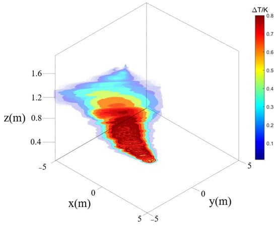 The three-dimensional reconstruction of the gas cloud was developed by stacking the temperature fields. In this experiment, the temperature field data reconstructed from 150 horizontal profiles shown in the fifth frame in Figure 20 were used to continuously stack the three-dimensional temperature fields of SF6 gas along the axis direction. As shown in Figure 22, according to the changes in the temperature field, after the SF6 gas was ejected from the hose port of the gas tank, the gas diffused outward and the concentration gradually decreased under the influence of the external wind. The gas leakage range gradually increased, and the location of the high-concentration area is obvious within the range of 0.8 m in height from the hose port. The diffusion trend of the gas is consistent with that observed in the image.