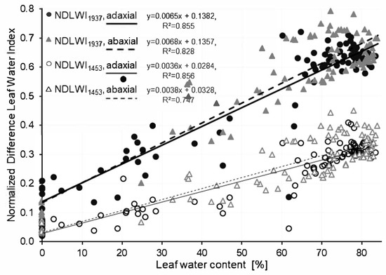 Relationship between water content of grapevine (cv. Mueller-Thurgau) leaves and Normalized Difference Leaf Water Index calculated using the water absorption bands at 1453 nm and 1937 nm, respectively. Hyperspectral imaging of adaxial and abaxial leaf sides in two independent experiments (n = 88).