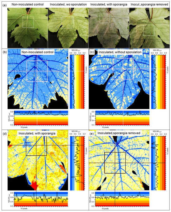 Detection of the effect of resistance reactions of grapevine cvs. Regent and Solaris to infection by P. viticola—i.e., spots of brownish tissue—on the water status of the abaxial leaf side 9 d p.i. (a) Non-successful attempt because of insufficient spatial sensor resolution; RGB images clearly showed brown spots; (b–e) detection and characterization of the effect on water status of leaves of cv. Regent (b,c) and Solaris (d,e) with improved spatial resolution.