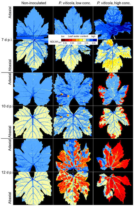 The negative effect of P. viticola on the water status of compatible grapevine leaves depended on the severity of downy mildew symptoms per leaf and was even promoted by spells of 100% RH, inducing abundant sporangia formation on abaxial leaf sides (Figure 6). Although more pronounced on the abaxial side, the effect of downy mildew on the pattern of leaf water status could also be measured on the adaxial side, even at 7 d p.i. when downy mildew reduced NDLWI1937 values by 0.2 units or less. The desiccation of leaf margins and tissue spots in later stages caused identical NDLWI1937 values < 0.3 on both leaf sides. As NDLWI1937 of adaxial sides was always about 0.05 units higher than that of abaxial sides—irrespective whether infected or not—the contrast in leaf water contact between affected and non-affected areas was stronger for the adaxial side (Figure S3). LWC of veins of strongly damaged grapevine tissue indicated a still functional system of water transport.