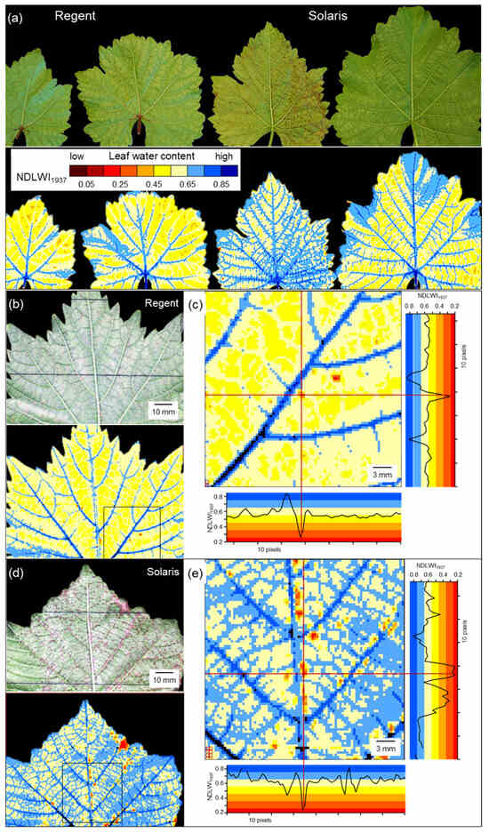 First experiments on the influence of P. viticola infection of cvs. Regent and Solaris with partial downy mildew resistance were not successful, as the spatial resolution of the sensor system was not sufficient when the working distance was 0.6 m (0.67 mm per pixel; Figure 7a). The tiny brownish tissue spots (Ø 1–2 mm) on leaves were clearly visible in RGB images. In corresponding NDLWI1937 images, however, they were hardly detected or not at all. Imaging data with the best spatial resolution available—0.34 mm per pixel, working distance 0.3 m—were suitable to detect and to characterize the spots of resistance reactions for both host genotypes (Figure 7b–e). NDLWI1937 profiles of the affected leaf tissue of both V. vinifera cultivars demonstrated a sharp and strong decline in water content with NDLWI1937 values as low as 0.3. The spatial dimension of this effect was strictly limited—2 to 6 pixels—and the water content of neighboring tissue was not affected.