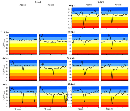 Profiles of NDLWI1937 values along transects through individual leaf spots caused by P. viticola infection indicated a rapid decrease of leaf water content from 0.65–0.70 to 0.45–0.55 and 0.30–0.35 at 14 and 18 d p.i., respectively (Figure 10). The size of the affected tissue area increased with the level of NDLWI1937 reduction. Brown spots of cv. Solaris had a strong reduction in leaf water content in the early stage, a transient resurge 11 d p.i. (when deposits on the stomata reduce stomatal transpiration) and a subsequent aggravation and attenuation—in both the level of reduction and the area affected—of the effect on water content for the abaxial and adaxial leaf sides, respectively.