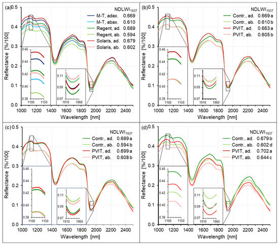 Effects of cultivar, leaf side, and infection by P. viticola on spectral characteristics of grapevine leaves, highlighting the spectral ranges used to calculate the NDLWI1937 (inserts). (a) Effect of grapevine genotype and leaf side; (b) effect of leaf side and downy mildew on reflectance of cv. Mueller-Thurgau, 8 d p.i.; (c) effect of leaf side and tiny spots of brown tissue on reflectance of cv. Regent, 8 d p.i.; (d) effect of leaf side and tiny spots of brown tissue on reflectance of cv. Solaris, 8 d p.i. Mean spectra of >6500 pixels per leaf (n = 4). ab(ax)., abaxial leaf side; ad(ax)., adaxial leaf side; NDLWI1937 values followed by the same letter were not significantly different (Tukey–Kramer test, p ≤ 0.05).
