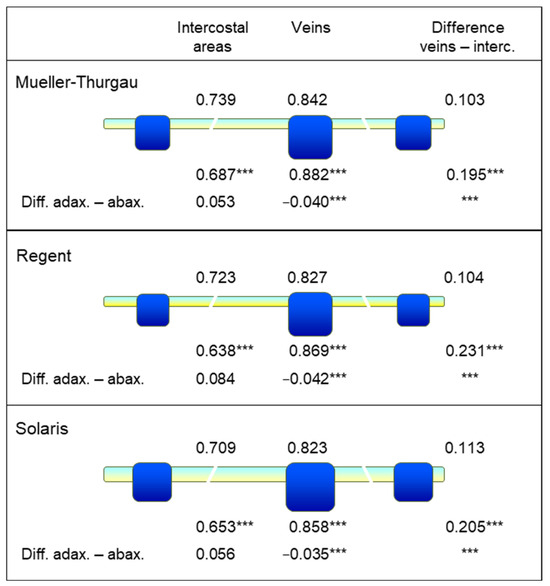 Effect of leaf side and tissue type—veins and intercostal areas, respectively—on NDLWI1937 values of three grapevine genotypes under greenhouse conditions. For all genotypes, leaf water values were significantly higher for the adaxial than for the abaxial leaf side (n = 6). Leaf veins had higher leaf water content than intercostal areas, and the difference between adaxial and abaxial leaf sides was positive and negative for intercostal areas and leaf veins, respectively (*** highly significant according to t-test). Thickness of intercostal areas and leaf veins (2nd order) of grapevine leaves differed among genotypes as indicated by the size of these structures.