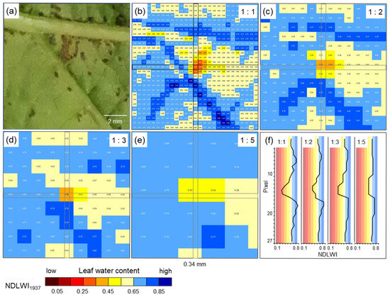 Effect of spatial resolution on the sensitivity of hyperspectral assessment of LWC of grapevine (cv. Solaris) 9 d p.i. with spots of brown issue in response to P. viticola infection by applying NDLWI1937. (a) RGB image; (b) original spatial resolution of hyperspectral sensor with 0.34 mm pixel size (27 × 27 pixels); (c) spatial resolution reduced by 1:2; (d) spatial resolution reduced by 1:3; (e) spatial resolution reduced by 1:5; (f) NDLWI1937 profile of column #14 at different spatial resolutions demonstrating the reduction in sensitivity.