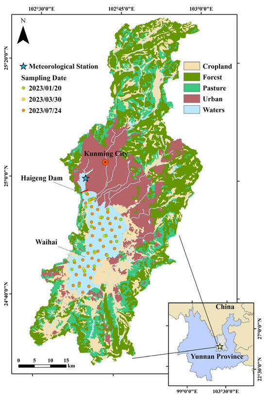 Dianchi is located within the city of Kunming, Yunnan Province, covering an area of 309.50 km2, with a corresponding storage capacity of 1.56 billion m3 and an average depth of 5.3 m. The total watershed area is 2920 km2 [20,21]. In 1996, the Haigeng Dam was completed, dividing Dianchi into northern Caohai and southern Waihai. The two regions differ significantly in water quality and area (Figure 1). Southern Waihai is the main part of Dianchi, with an area of 289.2 km2, accounting for 96.4% of the lake. This study focuses on Waihai, and Dianchi will be used as a shorthand for Waihai in the following sections. The average annual precipitation in the Dianchi basin is 933.3 mm, with an average of 816.8 mm during the flood season, constituting 87.5% of the annual precipitation. The average annual temperature and evaporation in the basin are 14.7 °C and 1409.4 mm, respectively [22], with minimal temperature variation throughout the year and high evaporation rates. The main rivers in the Dianchi basin flow through the urban area of Kunming, where farmland and construction land are predominant, leading to significant anthropogenic disturbances. Waihai has long been in a eutrophic state, classified as moderately to lightly eutrophic between 2001 and 2018 [23]. According to the 2022 Yunnan Province Ecological Environment Bulletin, the water quality of Waihai is categorized as Class V, failing to meet the Class III water function target, with a nutritional status of mild eutrophication.