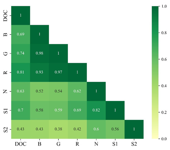 Raw image bands may exhibit high correlations, and using a single band to represent the optical activity of DOC has limitations. However, new features derived from combinations of multiple bands can provide deeper insights [28,29], with band combinations shown in Table 2. The DOCc from the matchups was used as the dependent variable, and the band combination with the highest correlation was selected as the independent variable. A leave-one-out cross-validation method was employed to establish the surface DOC retrieval model [30].