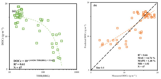 Pearson correlation of the Surface DOC concentration and band combination (a), and the fitting performance of the derived algorithm (b).