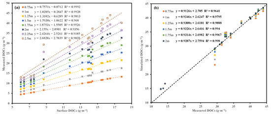 In Formula (2), is the integral of vertical DOCc when the surface concentration is DOCc (unit: mg·m−2), with and representing the functions for the slope and intercept, respectively.