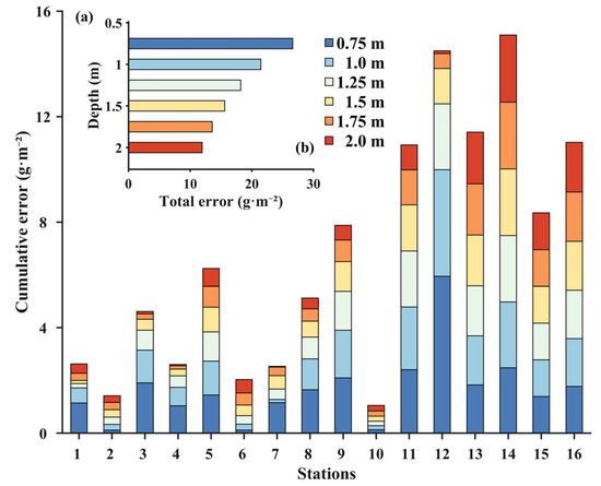 Similarly, to determine the starting depth of the mixed layer with a 0.25 m interval, the value of “0.75 m” on the vertical axis in Figure 5a represents the mixed layer starting from 0.75 m below the water surface. The total error in Figure 5b is the sum of the absolute errors for all measurement points under each depth scenario. When the mixed layer is set at 0.75 m, the maximum error occurs at the 12th station, reaching −5.95 g·m−2. Although the maximum error for DOCs estimation at station 14 is 2.54 g·m−2 when the mixed layer is set at 2 m, the total error is only 11.96 g·m−2 in 2.0 m (Figure 5b), which is the smallest among all scenarios (Figure 4b). All depth scenarios show significant overestimation errors at stations 13 to 16, with errors greater than 1.3 g·m−2. In contrast, for the remaining stations, the DOCs estimation errors for the 2 m mixed layer depth scenario remain at very low levels, with an average error of less than 0.12 g·m−2. Therefore, based on the vertical DOCc data measured in this study, the mixed layer for Dianchi can be set at a depth of 2 m below the water surface according to assumption (2).