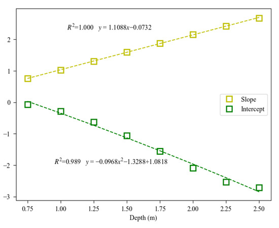 The fitting relationship between slope and intercept with water depth in DOCs retrieval model.