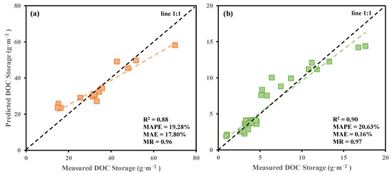 The fitting results of the DOC storage retrieval model are presented in (a) with overlaid upper layer DOC storage and in (b) without overlaid upper layer DOC storage.