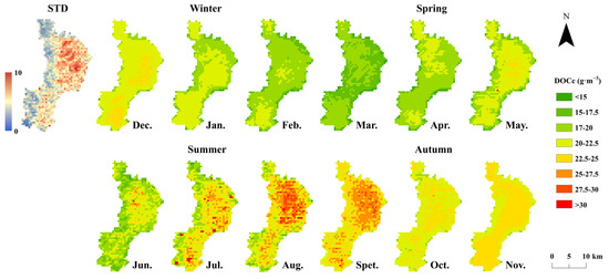 3.4. Spatiotemporal Variation Characteristics of DOC Storage