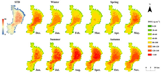 Based on the developed surface DOCc and vertical DOCs retrieval model, DOCs in Dianchi were inverted using MOD09GA images from 2000 to 2023. The results of DOCc (Figure 8) and DOCs (Figure 9) are aggregated on a monthly basis. The analysis reveals distinct spatial distribution differences in DOCs across various time periods, with a consistent spatial feature of “high central storage”. From April onward, large areas of high DOC storage (80–100 g·m−2) start to appear in the central part of the Dianchi. In May, these high-storage areas continue to expand, and regions with extremely high storage (>120 g·m−2) begin to form. By July, the area with high storage reaches its maximum and remains significant through September, with the extent of extremely high storage also peaking in September. From October to November, the extent of high and extremely high storage slightly decrease, but these areas still represent the largest proportion. Starting in December, there is a rapid reduction in both high and extremely high storage areas, reaching their minimum by March. It is noteworthy that the southern part of the Dianchi also exhibits a similar spatial variation pattern from July to December, with consistent high and extremely high DOCs features.