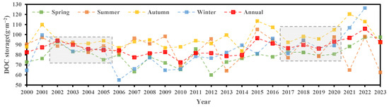 Temporal variation of seasonal average DOC storage in Dianchi, with the grey dashed box indicating years where the coefficient of variation of seasonal averages was below 10%.